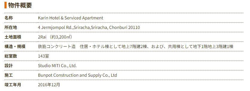 カリンホテル&サービスアパートメント(KARIN HOTEL & SERVICED APPARTMENT) はシラチャにある日系企業が運営するサービスアパートメントです。タイ・チョンブリー県のシラチャにおける日本人駐在員・出張者様向けのホテル&サービスアパートです。タイの中でも日系企業の製造拠点が集積し多くの日本人の方々が活躍されているシラチャで、 特に単身で赴任されている日本人の皆様の心身両面の健康をサポートし、 Work hard, Play hard, Rest wellな充実した駐在生活(よく働き、よく遊び、よく休む、メリハリのある駐在生活)を 送ることができる空間創りを目指しています。